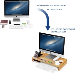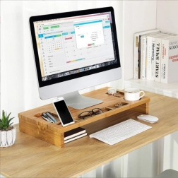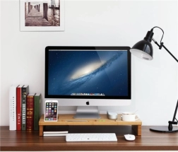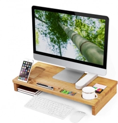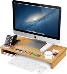 Elegáns bambusz monitorállvány, amely ergonomikus magasságba emeli a képernyőt, és egyben praktikus rendezőként is szolgál. Telefontartó, toll- és apróságrekeszeket, külön helyet a bögrének, valamint helyet a billentyűzetnek és egérnek kínál az állvány alatt. A természetes megjelenés és a tartós bambusz rendet és kényelmesebb testtartást biztosít a munkához.