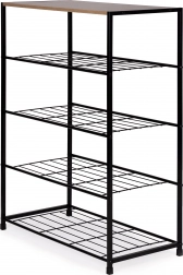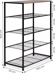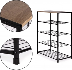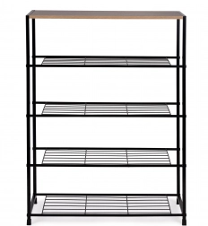 Stílusos, loft stílusú cipőtartó, amely ötvözi a stabil fekete fém vázat és a dekorációkhoz vagy kulcsokhoz ideális tágas fa felső lapot. Öt szintnyi fém rácspolc akár 12–16 pár cipő tárolására is alkalmas, tökéletes az előszobába, nappaliba, gardróbba vagy irodába. Kompakt méretek, magas teherbírás és könnyű karbantartás – univerzális megoldás a mindennapi rendszerezéshez.