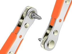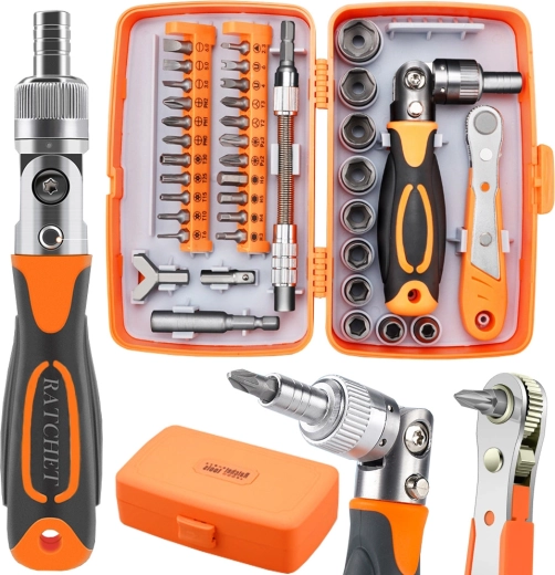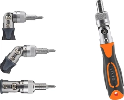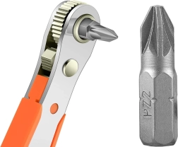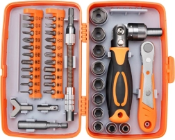 A készlet tartalmaz egy praktikus racsnit és racsnis csavarhúzót a bitekhez, ideális különféle csavarozási feladatokhoz.