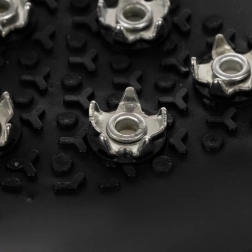 A stratégiailag elhelyezett fém tüskék stabil tapadást biztosítanak jeges felületen és letaposott havon.