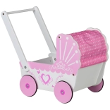 KIVITELEZÉS: A babakocsi fából készült, kellemes színösszeállításban. A fehér felületen rózsaszín szívecskék találhatók. Rózsaszínűek a kerekek, a tető és a belső bélés is.