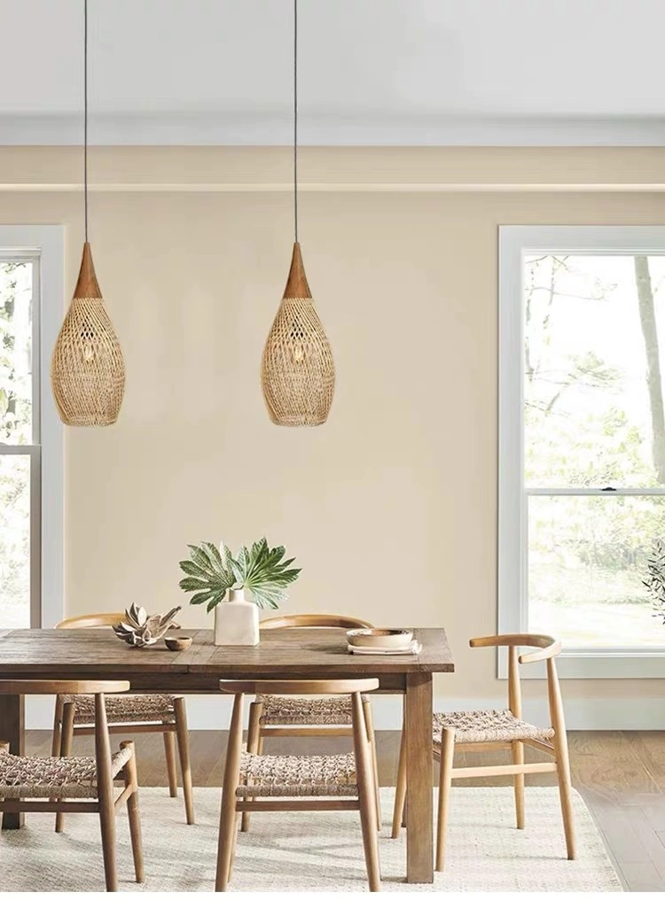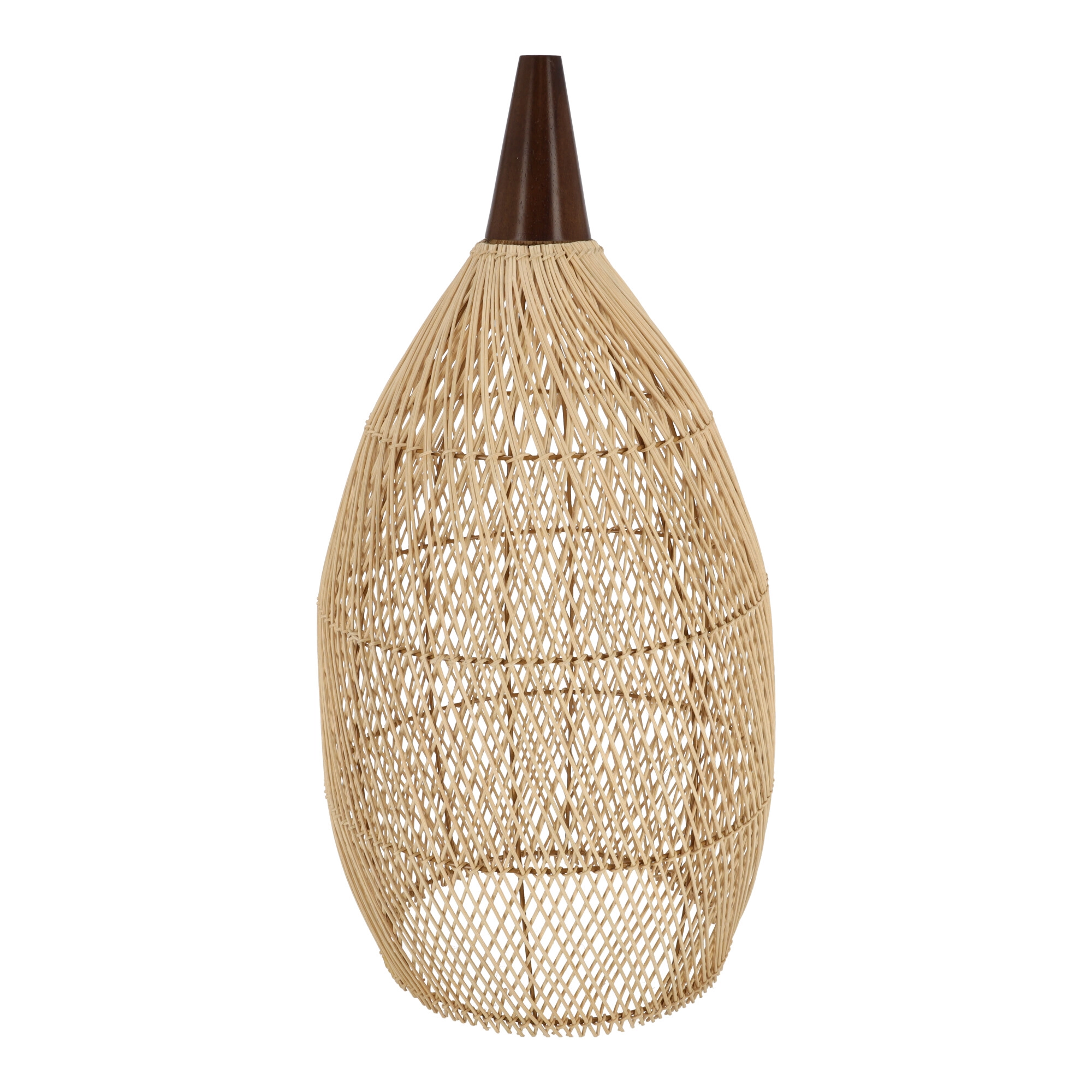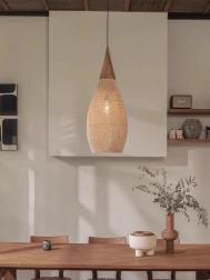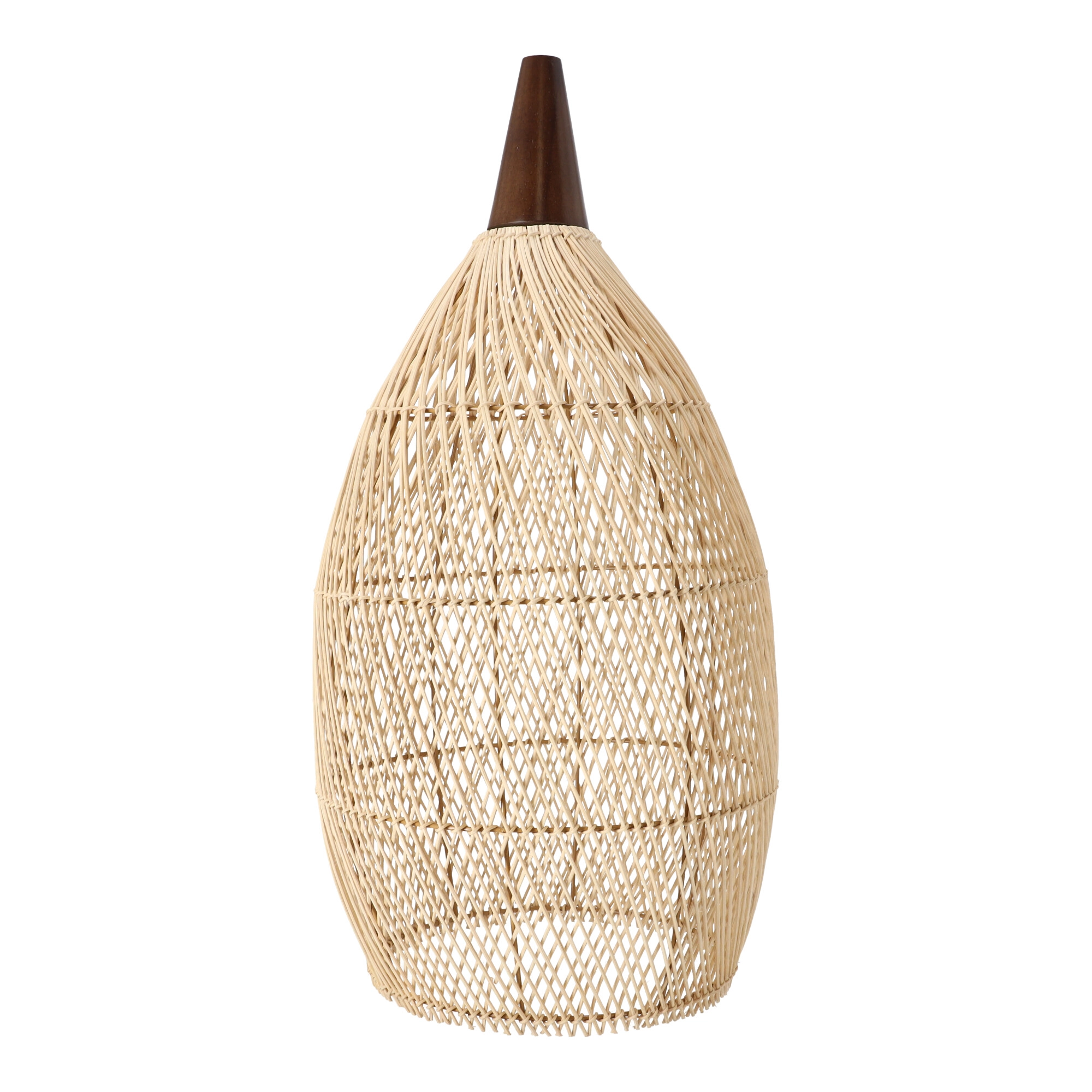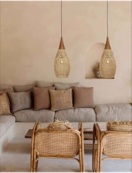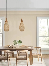 Elegáns, természetes rattanból és fából készült függesztett lámpa, amely meleg, otthonos fényt és természetes bájt visz a térbe. Időtlen formájának és anyagainak köszönhetően remekül illik boho, skandináv és rusztikus enteriőrökbe – nappaliba, étkezőbe és hálószobába.
