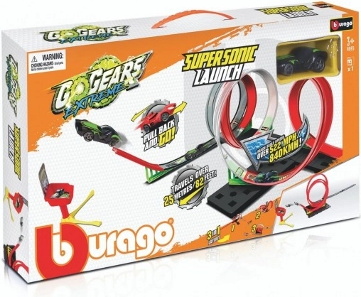 Élvezd az adrenalindús száguldást a Bburago GoGears Extreme SuperSonic Launch 3 az 1-ben gyerek versenypályával. A készlet extrém hurkokat, 3 pályakonfigurációt és visszahúzós kisautót kínál, akár 25 m hatótávval. A strapabíró műanyag kivitel, az egyszerű átrendezés és a játékban skálázott, 840 km/óra feletti sebesség órákon át tartó szórakozást garantál a 3 évesnél idősebb kis versenyzőknek.