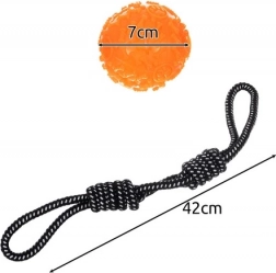 Az erős fekete-fehér kötél és a texturált narancssárga gumi bírja az intenzív igénybevételt, és segít a fogak tisztításában, valamint az íny masszírozásában játék közben.