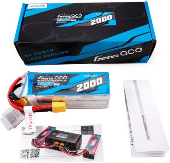 Nagy teljesítményű és könnyű, nagyfeszültségű Gens Ace 2000 mAh 22,8 V 60C 6S LiPo akkumulátor XT60 csatlakozóval RC repülőkhöz, autókhoz és helikopterekhez. Stabil teljesítményt, magas, 60C folyamatos kisütési áramot (rövid ideig akár 90C) és alacsony, 297 g-os tömeget kínál a kiváló teljesítmény–tömeg arányért.