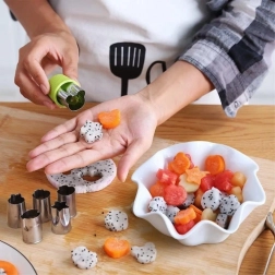 Ez a praktikus kivágó készlet ideális minden kreatív főzés vagy sütés iránt érdeklődő személy számára. Segítségével könnyen készíthet lenyűgöző dekorációkat gyümölcsökből és zöldségekből, melyek egyedivé varázsolják az ételét.