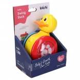 Színes kacsa a kerekeken felkelti a gyerekek figyelmét a ringató mozgással és a csörgő hangokkal a kis golyókkal.