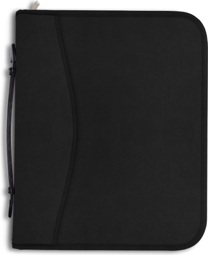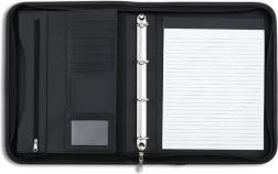 Az elegáns, A4-es formátumú ATLANTA konferenciamappa matt fekete színben biztonságos cipzáras zárást, praktikus 4-gyűrűs mechanikát és vonalazott A4-es jegyzettömböt kínál. Nem hiányoznak a dokumentum- és névjegyzsebek, valamint a kényelmes hordozófül sem.