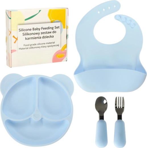 A készlet kiváló minőségű, élelmiszeripari minőségű, káros anyagoktól mentes szilikonból készül; tapintása puha, tartós és könnyen tisztítható. A maci alakú osztott tányér megkönnyíti az átlátható tálalást, a mély zsebbel ellátott előke tisztán tartja a ruhát, az ergonomikus evőeszközök puha szilikon fogóival pedig jól illeszkednek a kis kezekbe.