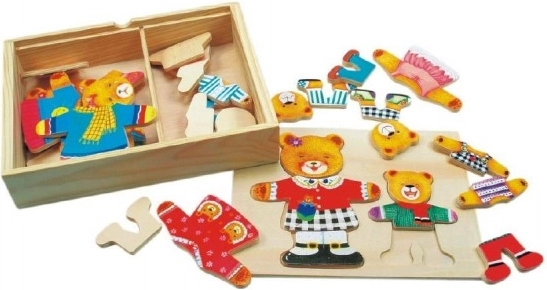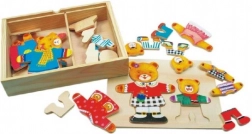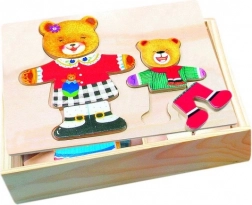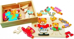 Fa öltöztetős puzzle a Bino-tól szórakozást és tanulást egyaránt kínál egy praktikus csomagban. A gyerekek a darabokat a doboz fedelébe illesztve különböző ruhákat alkothatnak a mackóknak saját fantáziájuk alapján.