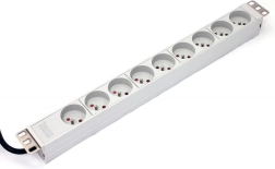 Masszív alumínium 19" rack PDU elosztó 9 db E típusú aljzattal és 1,8 m-es kábellel, Schuko villásdugóval. 16 A terhelhetőséget kínál, többféle szerelési szöggel, kaszkádolható összekötéssel, és RACK szerelési tartozékokkal kerül szállításra.