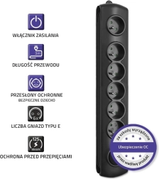 A megvilágított Quick Switch lábkapcsoló révén könnyen és gyorsan kapcsolhatja be vagy ki az áramellátást hajolgatás nélkül; a fényjelzés egyértelműen mutatja, amikor a csatlakoztatott eszközök feszültség alatt vannak. Biztonságáról a varisztoros túlfeszültség-védelem, a minden aljzatban megtalálható gyermekzár és a nem éghető PP burkolat gondoskodik. A gyártó a műszaki adatok megváltoztatásának jogát fenntartja.