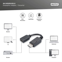 Ez a rövid, DisplayPort (DP) – HDMI Type A adapter ideális notebook vagy PC HDMI-s monitorhoz, projektorhoz vagy televízióhoz való csatlakoztatásához. A DisplayPort csatlakozó retesze szilárdan ül a portban, stabil kapcsolatot biztosítva nem kívánt kilazulás nélkül.