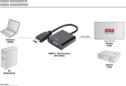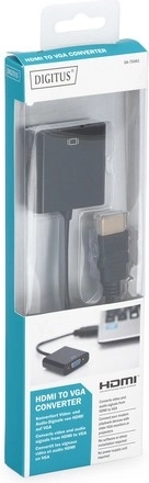 A DIGITUS univerzális átalakítója a jelet HDMI-ről VGA-ra alakítja, és egyidejűleg 3,5 mm-es hangkimenetet kínál. Támogatja a Full HD 1080p felbontást, plug & play módon működik, illesztőprogram nélkül – ideális laptopok, lejátszók és játékkonzolok csatlakoztatásához régebbi, VGA-s monitorokhoz és projektorokhoz.