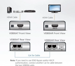 VE800A HDMI extender akár 60 m-rel meghosszabbítja a HDMI monitor hatótávolságát egyetlen Cat 5e kábelen keresztül hordozható HDMI eszközről. Az ATEN VE800A új technológiát alkalmaz, amely lehetővé teszi az A/V jelek átvitelét egyetlen Cat 5e kábelen. Elérhető egy DDC port, amely lehetővé teszi az EDID monitor használatát egy további Cat 5e kábel csatlakoztatásával. A VE800A támogatja a HDMI funkciókat, például a 3D-t és a Deep Color-t, így azt a kiváló képminőséget nyújtja, amelyet elvár.