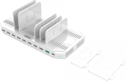 A töltőállvány akár 10 eszközt is képes egyszerre tölteni, kimeneti áramerősséggel akár 2.4A-ig.