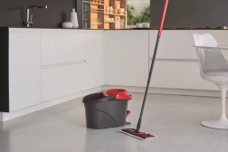 A lábpedállal és újratervezett szűrőbetéttel ellátott vödör lehetővé teszi a víz alapos kicsavarását és a felmosó nedvességtartalmának szabályozását – gyorsan, kényelmesen és anélkül, hogy a piszkos vízzel érintkezne.