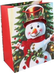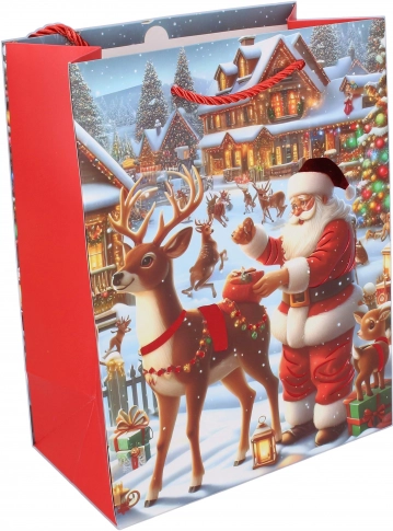 Stílusos ajándéktáska L méretben, 32 × 41,5 × 12 cm méretekkel, ideális nagyobb ajándékok csomagolásához. Karácsonyi motívumot, masszív kivitelezést és könnyű hordozhatóságot kínál. Elérhető 4 féle mintával a tökéletes ünnepi hangulathoz.
