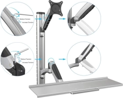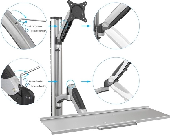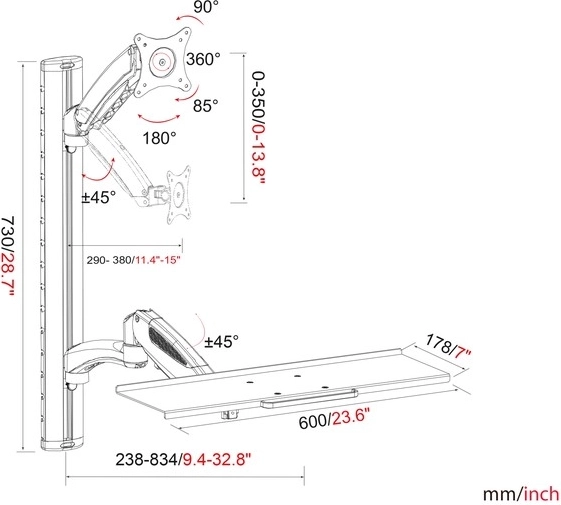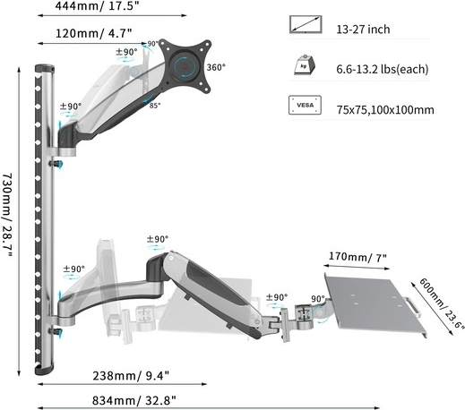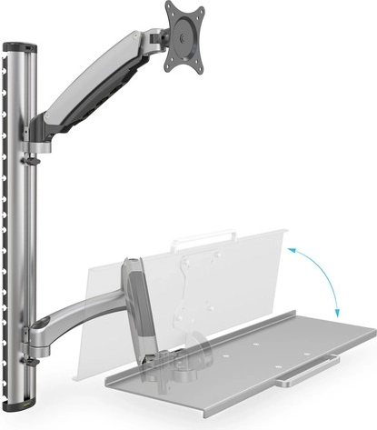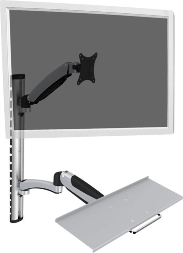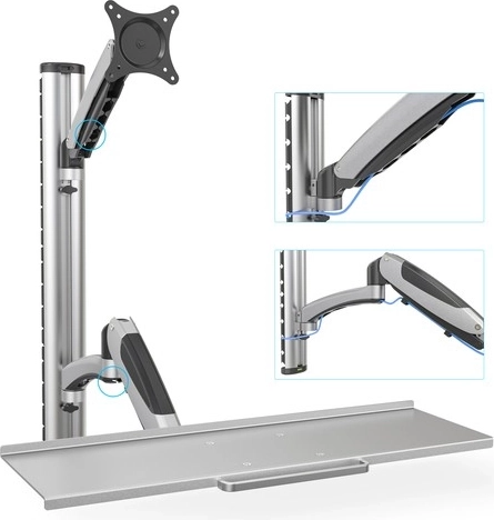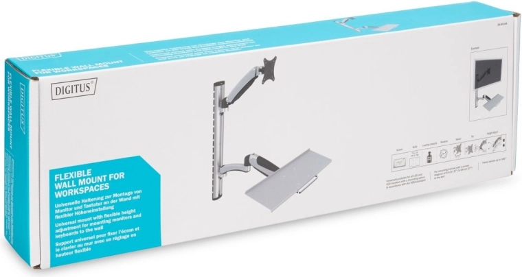 Erős fali kar lehetővé teszi monitor vagy tévé és billentyűzet telepítését, biztosítva maximális rugalmasságot és kényelmet munkahelyen vagy otthon. VESA (75x75, 100x100) szabvány szerinti lyukakkal rendelkezik, ami max. 27" monitor és max. 8 kg súlyú eszközök szerelését teszi lehetővé. A kar 360 fokban képes a monitor forgatására és széleskörű horizontális és vertikális beállítást kínál. Rendelkezik integrált kábelkezelő rendszerrel, ami garantálja a tiszta és rendezett teret. Kiváló minőségű anyagból készült, szürke porfestéssel.