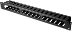 A 30 × 130 mm méretű három széles átvezető nyílás megkönnyíti a kábelek rendezését és tehermentesítését, javítja a légáramlást, és hozzájárul a letisztult, professzionális megjelenéshez. A RAL 9005 fekete kivitel tökéletesen illeszkedik a legtöbb rack-komponenshez.
