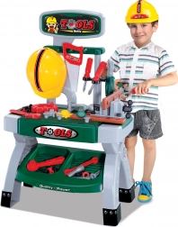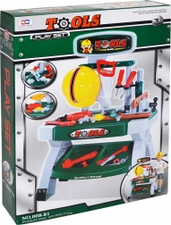 A készlet széles eszközkínálatot tartalmaz: sisakot a biztonságos játékhoz, kötőelemeket, mint csavarok és anyák, működő elemeket, például fogaskerekeket, valamint kedvelt szerszámokat, köztük fogót, kalapácsot, kulcsokat, fűrészt, kombinált fogót, csavarhúzókat és satut.