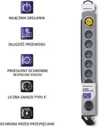 Tegyen rendet a kábelek között, és védje elektronikáját a praktikus hosszabbítóval, amely 8 aljzattal és túlfeszültség-védelemmel rendelkezik. A megvilágított, lábbal működtethető Quick Switch kapcsolóval kényelmesen ki- és bekapcsolhatja az áramot lehajolás nélkül. A nem éghető anyagból készült tartós kivitel, a gyerekzárak és a bútora szerelhetőség biztonságos és elegáns megoldássá teszik otthonba és irodába egyaránt.