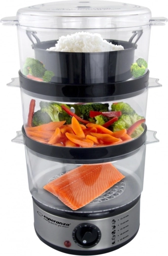 A három átlátszó szint lehetővé teszi különféle ételek egyidejű elkészítését – zöldség, hal, rizs vagy hús – illatok átvitele nélkül. Az időzítő és az áttekinthető kezelőfelület teljes kontrollt ad a főzési folyamat felett, míg a kompakt kialakítás helyet takarít meg a konyhapulton.
