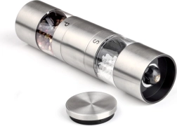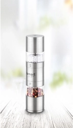 Kézi fűszerdaráló elegáns és praktikus eszköz minden konyhába. Ezüstszínű fémből és átlátszó műanyagból készült, két külön rekeszt kínál sóhoz és borshoz, ami jobb ellenőrzést biztosít a fűszerezés felett.