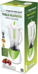 A praktikus Esperanza Pina Colada asztali turmixgép gyorsan elkészíti a smoothie-kat, koktélokat és a tejes shake-eket, sőt a jégzúzást is megoldja. A 350 W teljesítménynek, a 3 sebességfokozatnak és a Turbo funkciónak köszönhetően pillanatok alatt sima állagot érhet el. A rozsdamentes acél kések, az 1,5 l-es műanyag kancsó és a csúszásgátló tapadókorongok biztonságos és kényelmes használatot biztosítanak.
