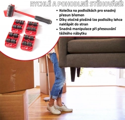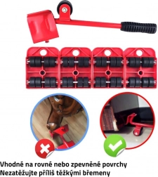 Praktikus készlet nehéz bútordarabok és háztartási gépek könnyű áthelyezéséhez akár 150 kg-ig. Tartalmaz egy emelőkart a bútor megemeléséhez, valamint négy szállítógörgőt csúszásgátló betéttel és 360°-os forgással, amelyekkel a mosógépet, hűtőt vagy komódot gyorsan, biztonságosan és megerőltetés nélkül mozgathatja.