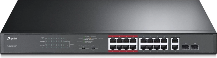 A TL-SL1218MP kapcsoló 16 PoE+ portot, 2 gigabites RJ45 portot és 2 gigabites SFP helyet kínál. A PoE Extend funkcióval az átvitel és tápellátás távolsága elérheti a 250 métert. Minden PoE port akár 30 W teljesítményt biztosít, összesen akár 192 W-ot minden eszköz számára.