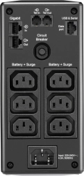 A hátlapi panel 6 db IEC C13 aljzatot, felügyelethez USB interfészt, valamint túlfeszültség-védelmet kínál a csatlakoztatott eszközök és adatvonalak számára.