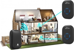 Vezeték nélküli és elemek nélküli ajtócsengő kinetikus nyomógombbal és akár 150 m hatótávval. 51 dallamot, 4 hangerőszintet kínál, köztük némítást, valamint kültéri nyomógombot IP44 védelemmel a megbízható működésért bármilyen időjárásban.