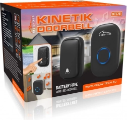 Nincs több kábel és elemcsere. Az MT5701 kinetikus csengő a gomb mechanikus megnyomásából nyeri az energiát, amelyet átalakít az aljzatba dugott vevőegység felé történő jeladásához szükséges elektromossággá. A telepítés gyors és tiszta – a nyomógombot az ajtónál vagy a kapunál helyezi el, a vevőt konnektorba csatlakoztatja.