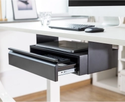 A Maclean asztali fiókrendező ideális megoldást kínál a munkaterület jobb szervezésére és bővítésére. Elegendő helyet biztosít dokumentumok vagy egyéb tárgyak számára. A fiók feletti extra tér körülbelül 450 x 310 mm méretű, elegendő helyet biztosít például egy laptopnak. A fiók tartós vezetőkön mozog, így magas stabilitást és biztonságot nyújt. A maximális terhelhetőség 5 kg.