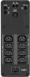Rendelkezésre áll 8× IEC C13 (6 szünetmentesen táplált + 2 túlfeszültség-védett), kommunikációhoz USB, valamint RJ45 a hálózati vonal túlfeszültség elleni védelmére.