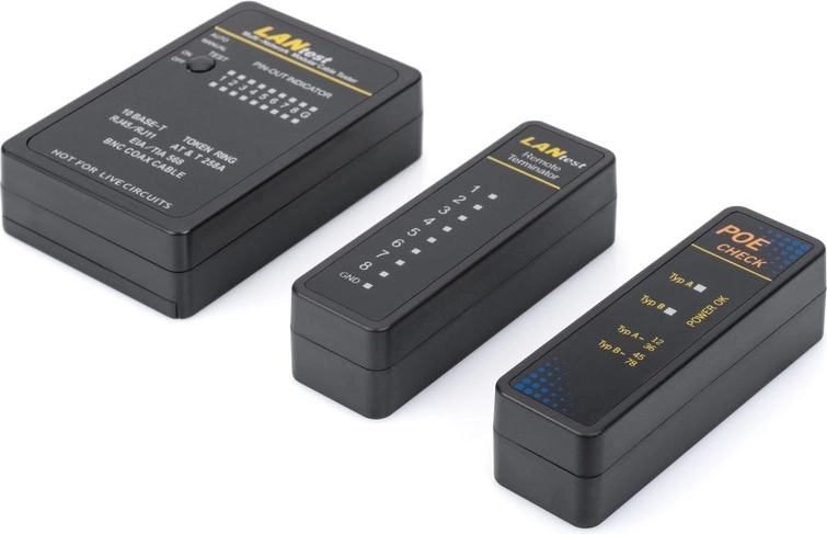 A beépített PoE Check funkció azonnal megmutatja, hogy elérhető-e tápellátás a porton az IEEE 802.3af/at szerint, és hogy milyen üzemmódban. A teszter alkalmas sodrott érpárú (UTP/FTP/STP) kábelekhez, RJ11/RJ12 telefonvonalakhoz és BNC koaxiális kábelezéshez is – ideális segítőtárs DSL csatlakozások telepítéséhez és LAN karbantartásához.