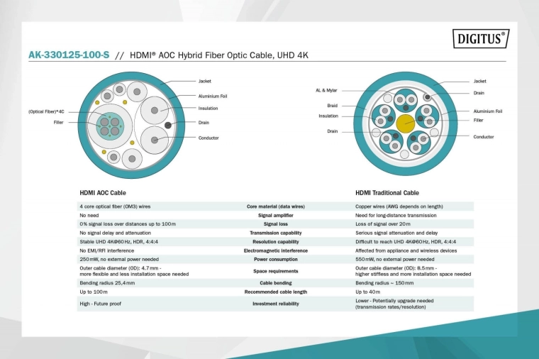 Az aktív hibrid AOC HDMI kábel réz vezetőket és optikai szálakat kombinál a tömörítés nélküli kép- és hangátvitelhez 4K/60 Hz felbontásban, 18 Gb/s sávszélességgel. A EMI zavarásnak ellenálló kialakítás, a HDMI 2.0b, HDCP 2.2, HDR támogatás és az olyan funkciók, mint az ARC, Dolby TrueHD, DTS‑HD MA, ideálissá teszik házimozihoz és tárgyalótermekbe egyaránt. Könnyű kivitel, kis hajlítási sugár és egyszerű Plug & Play telepítés.