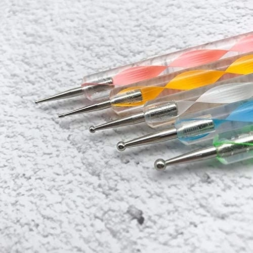 Az 5 db kétoldalas szonda készletünk professzionális és otthoni körömdíszítésre készült. Minden szonda fém gömb alakú tüskéket tartalmaz, amelyek ideálisak díszek alkalmazására vagy nedves lakkal illetve színes gélekkel való munkára.