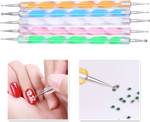 Bemutatjuk 5 db kétoldalas körömdíszítő szonda készletünket, ami ideális segítőtárs mind szalon, mind otthoni körömdíszítéshez. Minden szonda különböző méretű fémtüskékkel rendelkezik, ami megkönnyíti a díszítések, mint flitterek és kövek alkalmazását.