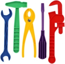 A készlet alapvető szerszámokat tartalmaz könnyű műanyagból – ideális méretű a gyerekkezekhez, éles élek nélkül a biztonságos játékért.