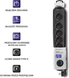 Ez a túlfeszültségvédett elosztó ideális megoldás az asztali, TV- vagy konyhai kábelezés rendezésére. A 6 aljzatnak köszönhetően egyszerre több eszközt csatlakoztathat, a 5 m hosszú kábel pedig szabad elhelyezést biztosít. A megvilágított lábkapcsoló (Quick Switch) kényelmes be- és kikapcsolást tesz lehetővé lehajolás nélkül.