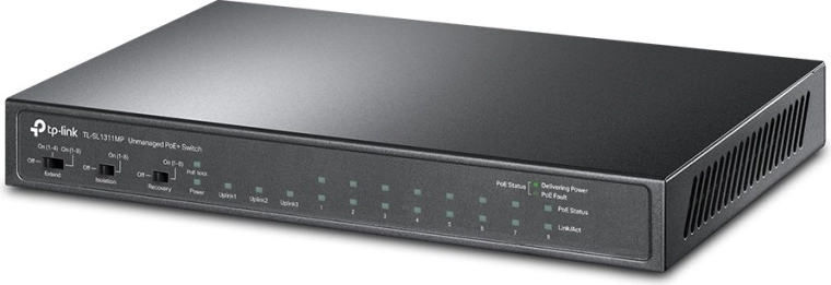 Kompakt nem menedzselt switch 8× 10/100 Mb/s PoE+ porttal, 2 gigabites RJ45 porttal és 1 gigabites SFP slottal. Plug and Play telepítést kínál, PoE tápellátást portonként akár 30 W-ig és összesített PoE keretet 124 W. Ideális IP kamerákhoz és megfigyeléshez, irodákba és kisvállalkozásoknak, a hatótáv akár 250 m kiterjesztett módben.