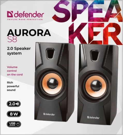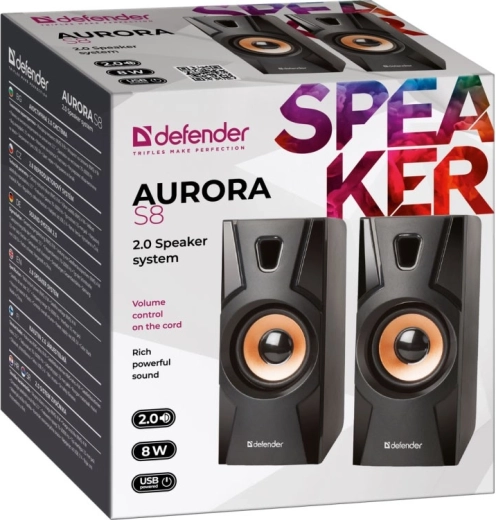 A DEFENDER Aurora S8 egy stílusos 2.0 asztali hangszórópár, amely gazdag és kiegyensúlyozott hangzással és rézszínű akcentusokkal ellátott modern dizájnnal örvendeztet meg. A kompakt méret helyet spórol az asztalon, mégis meglepően telt basszust nyújt a rezgő membránoknak köszönhetően.