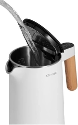 Stílusos dizájn: A Concept RK3300 Salt-Pepper vízforraló bármely otthont feldíszít. Látványos megjelenését a matt fehér test és a minimalista talp emeli ki, amelyet elegáns, fa hatású fogantyú egészít ki. 1,5 l kapacitásával akár 6 csésze kedvenc forró italát is könnyedén elkészítheti.