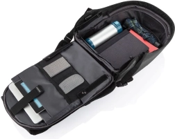 A hátizsák több rekesszel rendelkezik a tárgyak áttekinthető elrendezéséhez. Dupla zsebet tartalmaz táblagép és laptop számára.