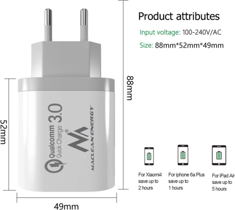 A Maclean Energy töltő lehetővé teszi, hogy akár 3 eszközt egyszerre töltsön a három USB portnak köszönhetően. A beépített modul automatikusan felismeri a csatlakoztatott eszközt, és a számára legmegfelelőbb és maximális árammal tölti. Ez biztosítja a leggyorsabb lehetséges töltési időt.