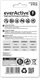 Az everActive lítium-elem készlet tartalmaz 4 x CR2032-t, 2 x CR2025-t és 2 x CR2016-t. Ideális sokféle eszközben való felhasználásra.