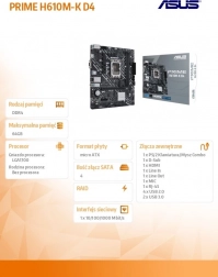 Az ASUS PRIME H610M-K D4 kompakt alaplap LGA 1700 foglalattal megbízható alapot kínál egy modern számítógéphez DDR4 memóriával, PCIe 4.0 csatolóval, gyors M.2 foglalattal NVMe SSD-hez és gazdag csatlakoztathatósággal, beleértve a HDMI, D-Sub, USB 3.2 Gen 1 és Realtek 1 Gb Ethernet lehetőségeket. Ideális választás költséghatékony összeállításokhoz a kompakt microATX formátumban.