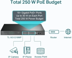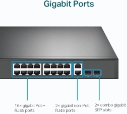 Ez a switch 16 gigabites porttal rendelkezik, PoE+ támogatással, valamint 2 gigabites RJ45 porttal és 2 gigabites combo SFP porttal a maximális csatlakozási rugalmasság érdekében.